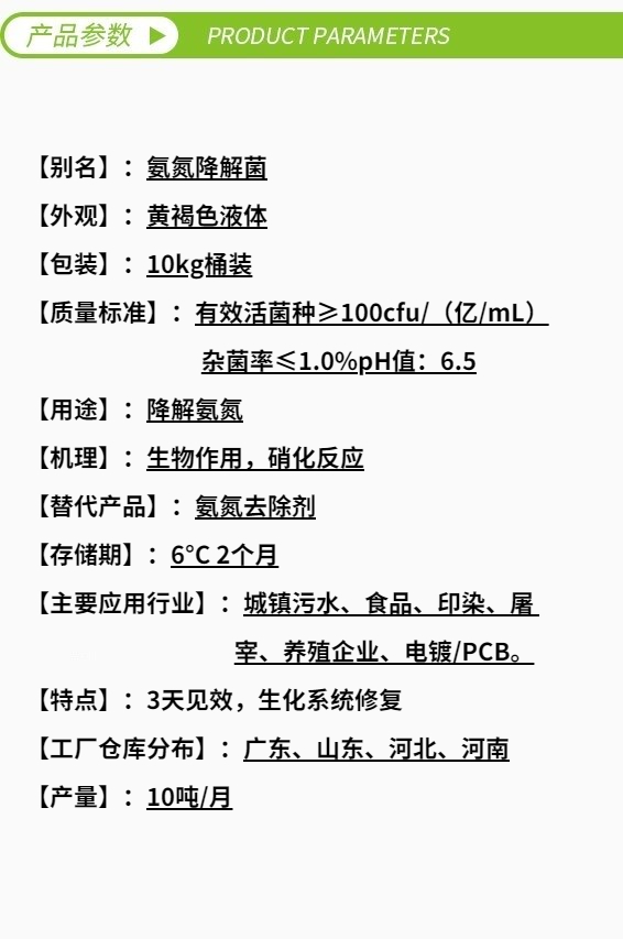 【使用條件】溶解氧:≥2 mg/L;溫度:12~42℃(最適 28~35℃);pH: 7~8;鹽度:≤15000mg/L;不含重金屬;不含生物毒性化合物。