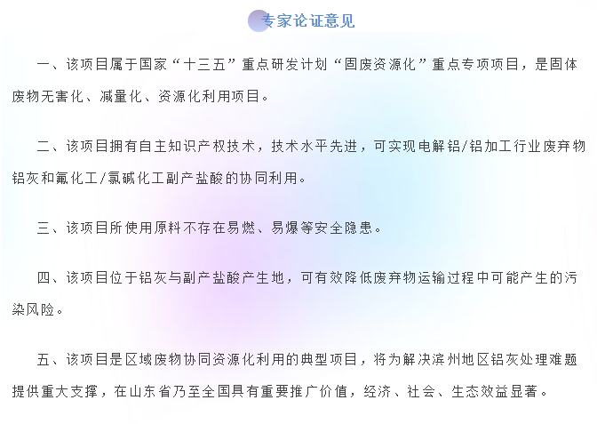 與會(huì)專家聽(tīng)取了建設(shè)企業(yè)及技術(shù)團(tuán)隊(duì)對(duì)技術(shù)總體情況的匯報(bào)。在充分質(zhì)詢、討論后,專家一致認(rèn)為,本項(xiàng)目技術(shù)路線合理、前期基礎(chǔ)扎實(shí),可實(shí)現(xiàn)電解鋁/鋁加工鋁灰和副產(chǎn)鹽酸的協(xié)同利用,屬典型的資源循環(huán)利用項(xiàng)目。