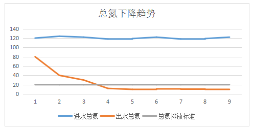 采用邁葳生化修復方案后,出水總氮由80mg/L持續(xù)下降,最終穩(wěn)定出水TN在10mg/L左右,達到一級B排放標準。